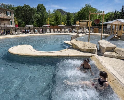 Nos plus petits campeurs profitent également avec vous des plaisirs de la baignade en barbotant dans notre pataugeoire sécurisée avec son petit toboggan et ses jeux d’eau.