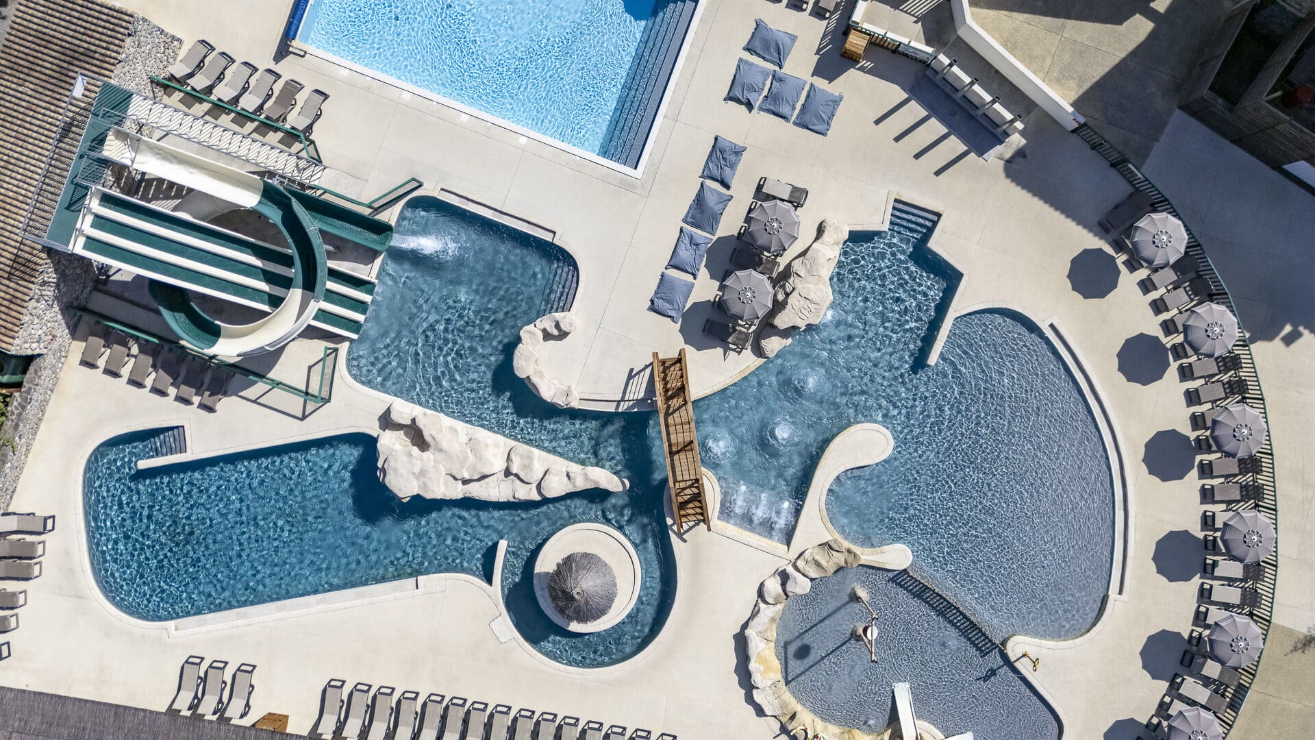 Terwijl zonaanbidders ontspannen in de ligstoelen, worden sensatiezoekers niet overgeslagen! Daag je vrienden of kinderen uit op onze waterglijbanen met meerdere banen. Lachen gegarandeerd! En ben je dapper genoeg om onze grote zwembadglijbaan met zijn indrukwekkende bocht te trotseren?